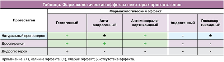 Все прогестагены связываются с прогестероновыми рецепторами и оказывают ожидаемый эффект на эндометрий, но некоторые из них имеют свой профиль активности в других тканях-мишенях, который может быть уникален в зависимости от гестагенного компонента. За последние десятилетия были разработаны новые прогестины, обладающие дополнительными положительными эффектами, такие как антиандрогенный и антиминералокортикоидный эффекты дроспиренона (таблица).