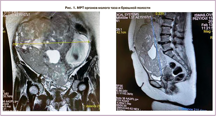 Заключение. Дифференциальная диагностика новообразований больших размеров, локализованных в малом тазу, представляет собой важную клиническую задачу с позиций не только профилактики возможных осложнений, требующих оказания экстренной медицинской помощи квалифицированными специалистами, но и оценки риска злокачественного процесса и возможной локализации опухоли в смежных органах, диктующих необходимость правильной маршрутизации пациентки и определения возможностей мультидисциплинарного подхода.