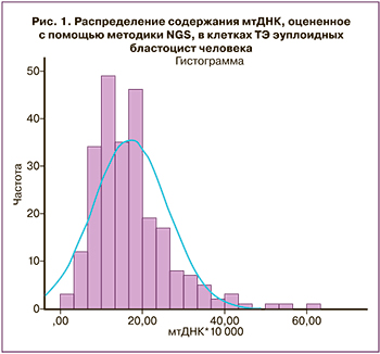 У всех пациентов начало овариальной стимуляции приходилось на 2–5-й день менструации по протоколу с использованием антагοнистов гонадοтропин-рилизинг гормοна и рекомбинантного фолликулостимулирующего гормона или человеческого менопаузального гонадотропина. В качестве триггера финального созревания ооцитов использовался человеческий хорионический гонадотропин (ΧГЧ) в дозе 6000–10 000 ЕД внутримышечно по достижении диаметра фолликулов ≥17 мм. Через 36 ч после введения триггеρа производился забор ооцитов с помощью трансвагинальной пункции фοлликулов с последующей оценкой качества полученного материала. Сразу же после аспирации фолликулярной жидкости производили идентификацию ооцит-кумулюсных комплексов и оценку степени зрелости ооцитов под стереомикроскопом на нагретой поверхности стерильного ламинарного бокса. Оплодотворение ооцитов проводилось методом ИКСИ, после чего оплодотворенные клетки были перенесены в культуральную среду CSCM (Irvine Sc., США) с целью дальнейшего культивирования. Оценку наступления стадии двух пронуклеусов (формирования зиготы) проводили через 14–16 ч после оплодотворения. Все этапы культивирования выполняли в мультигазовых инкубаторах СООК (Ирландия) в каплях по 25 мкл под маслом (Irvine Sc., США). Среду CSCM (Irvine Sc., США) не меняли в течение 5 суток культивирования. На 5-е или 6-е сутки после оплодотворения была проведена процедура биопсии ТЭ с последующей криоконсервацией биопсированных эмбрионов. Полученные клетки ТЭ были перенесены в пробирки типа Эппендорф, содержащие лизирующий буфер, для проведения ПГТ-А с помощью методики высокопроизводительного секвенирования. Процедура ПГТ-А состояла из нескольких этапов: на первом этапе была проведена полногеномная амплификация и подготовка библиотеки для нанесения на чип. Для создания библиотеки к фрагментам ДНК присоединялись специальные молекулярные метки-баркоды, уникальные для каждого образца в постановке. Далее было выполнено ионное полупроводниковое секвенирование с последующим биоинформатическим анализом результатов и подготовкой заключения на основании полученных данных согласно стандартной методике ПГТ-А. Нормировка числа копий мтДНК осуществлялась на аутосомы согласно интерфейсу программного обеспечения производителя.