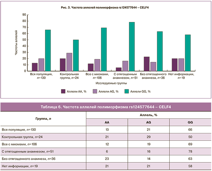 Гомозиготный вариант АА полиморфизма rs124577644 – СELF4 (табл. 6, рис. 3) встречается с наименьшей частотой – 6% у пациенток с отягощенным анамнезом по ММ по сравнению с другими группами, следовательно, данный вариант аллеля может являться «протективным», при этом гомозиготный вариант GG встречается в этой группе с наибольшей частотой – 78%, то есть может являться «аллелем риска».