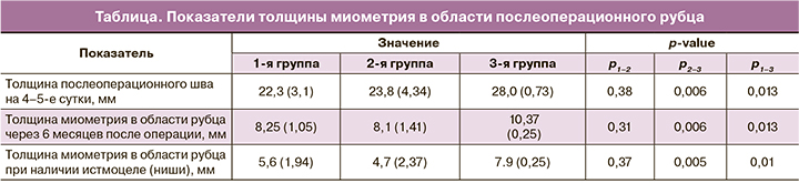 Средняя толщина миометрия в области послеоперационного рубца при двухрядном наложении шва составила 8,25 (1,05) мм, при наложении однорядного шва – 8,1 (1,41) мм, и эти данные не имели статистически значимых различий. В 3-й группе, где во время операции был использован шов по методике T. Vejnovic, среднее значение толщины миометрия в области послеоперационного рубца составило 10,37 (0,25) мм, что статистически значимо выше, чем в группе женщин с наложением двухрядного шва (p=0,01) и наложением однорядного шва (p=0,006) (таблица). При наличии ниши в 1-й группе при наложении двухрядного шва толщина миометрия в области послеоперационного рубца в среднем составила 5,6 (1,94) мм; при ушивании однорядным швом во 2-й группе данная величина оказалась минимальной, в абсолютных величинах составив 4,7 (2,37) мм, хотя статистически значимых различий получено не было. Наши результаты подтверждают данные, полученные в систематическом обзоре и метаанализе Di Spiezio Sardo (2017) [17], о том, что единственным отличием однорядного шва от двухрядного является более тонкий остаточный миометрий при сонографии. Статистически значимые значения по толщине миометрия в области послеоперационного рубца при наличии истмоцеле были нами получены в 3-й группе обследованных и составили 7,9 (0,25) мм, что выше, чем в 1-й группе – 5,6 (1,94) мм (p=0,01) и во 2-й группе – 4,7 (2,37) мм (p=0,005) соответственно (таблица).