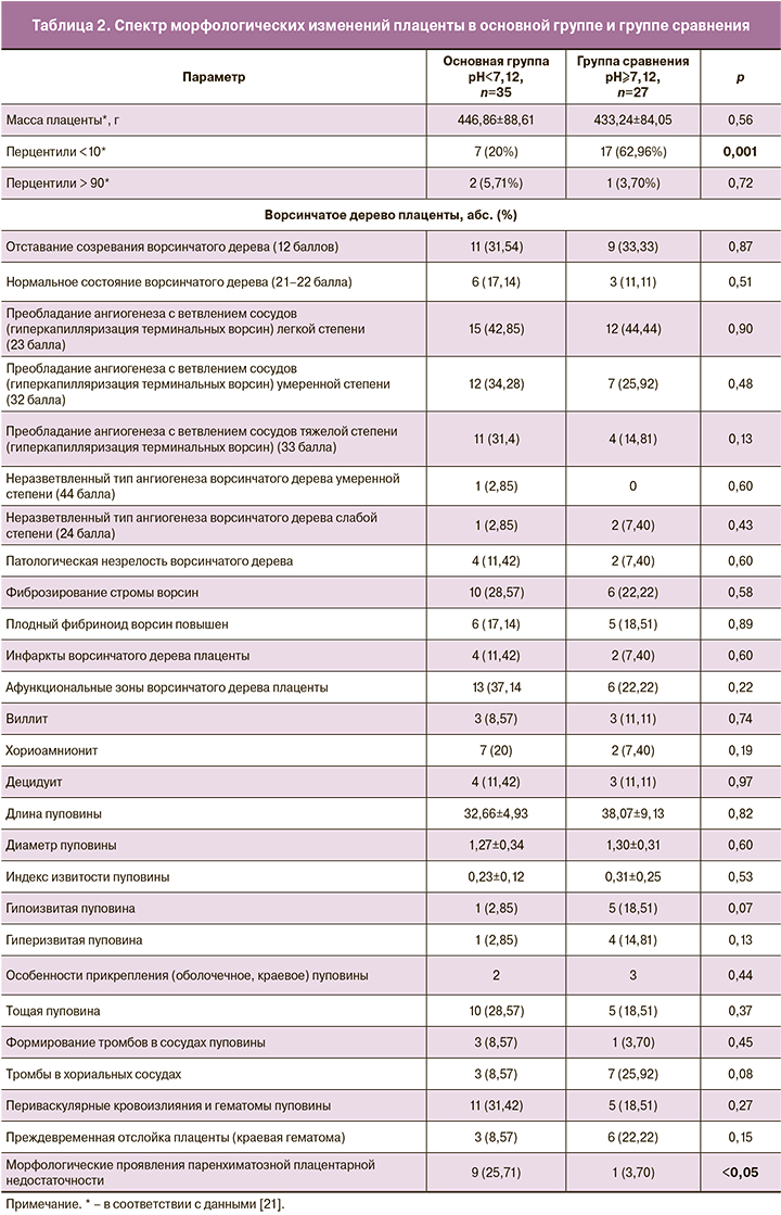 При доношенном сроке беременности после отделения плодных оболочек и пуповины масса плаценты в среднем составляет 470 г. Размеры плацентарного диска составляют в среднем 22×22×1,5–2,5 см [7, 13]. По данным нашего исследования, масса плаценты не коррелировала с состоянием плода и уровнем рН. Напротив, в группе сравнения в 2,4 раза чаще встречалась масса плаценты менее 10 перцентиля. Несмотря на выявленные различия в массе плаценты, морфологические изменения, которые могут быть квалифицированы как плацентарная недостаточность, значимо чаще были выявлены в группе острой гипоксии плода в родах. Полученные нами результаты указывают на то, что масса плаценты не находится в прямой пропорциональной зависимости со степенью кислородного обеспечения. Возможно, что более высокая масса плаценты в группе женщин с гипоксией плода отражает ее компенсаторные изменения в ответ на частичную морфофункциональную неполноценность, которую компенсирует увеличение массы плаценты.