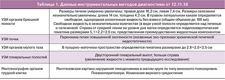 В общем анализе мочи – плотность <1,005, неизмененные эритроциты 50–60 в поле зрения; в гемостазиограмме Фибриноген – 2,12 г/л, протромбиновое время 18,4 с, протромбин по Квику – 48%, МНО 1,63, АЧТВ – 37,6, ТЭГ – прямая линия, D-димер – 73900 мкг/л. ADAMTS-13 10%. Антифосфолипидные антитела – не обнаружены. На посев взяты кровь, моча, слюна, кал, отделяемое из зева, трахеи, влагалища. Данные инструментальных исследований представлены ниже (табл. 1).