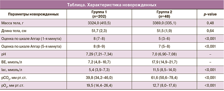В группе 2 отмечена более низкая оценка по шкале Апгар на 1-й и 5-й минутах жизни. Уровень лактата в артерии пуповины был выше, что сочеталось со снижением уровня рО2, увеличением рСО2 и ВЕ (таблица).