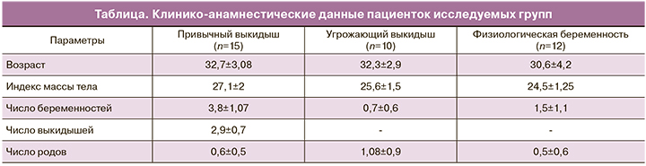 Пациентки трех групп были включены в исследование при сроке беременности 6–7 недель от первого дня последней менструации после подтверждения сердцебиения эмбриона по данным ультразвукового исследования. Критериями включения являлись: возраст женщин от 20 до 40 лет; самопроизвольное наступление беременностей (отсутствие бесплодия); отсутствие выраженных гормональных нарушений, регулярный менструальный цикл, отсутствие анатомических причин привычного выкидыша, подписанная пациенткой форма информированного согласия на проведение исследования.