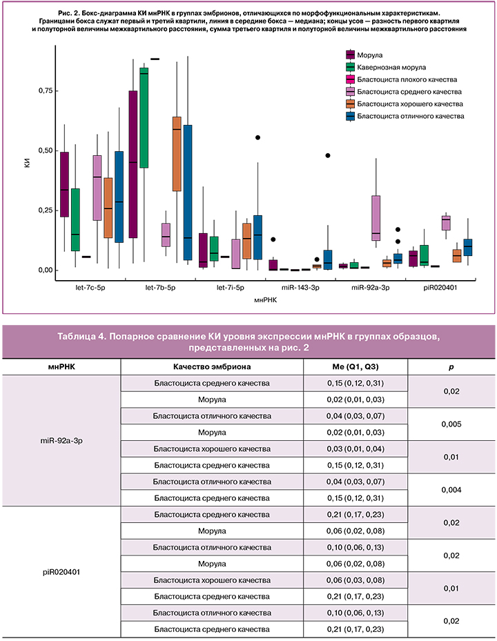 О взаимосвязи морфофункциональных характеристик эмбриона и профиля экспрессии мнРНК свидетельствует бокс-диаграмма (рис. 2), где отчетливо прослеживаются различия между группами сравнения в зависимости от вида мнРНК. Анализ уровня экспрессии мнРНК в сравниваемых группах методом Манна—Уитни выявил ряд статистически значимых отличий (табл. 4).