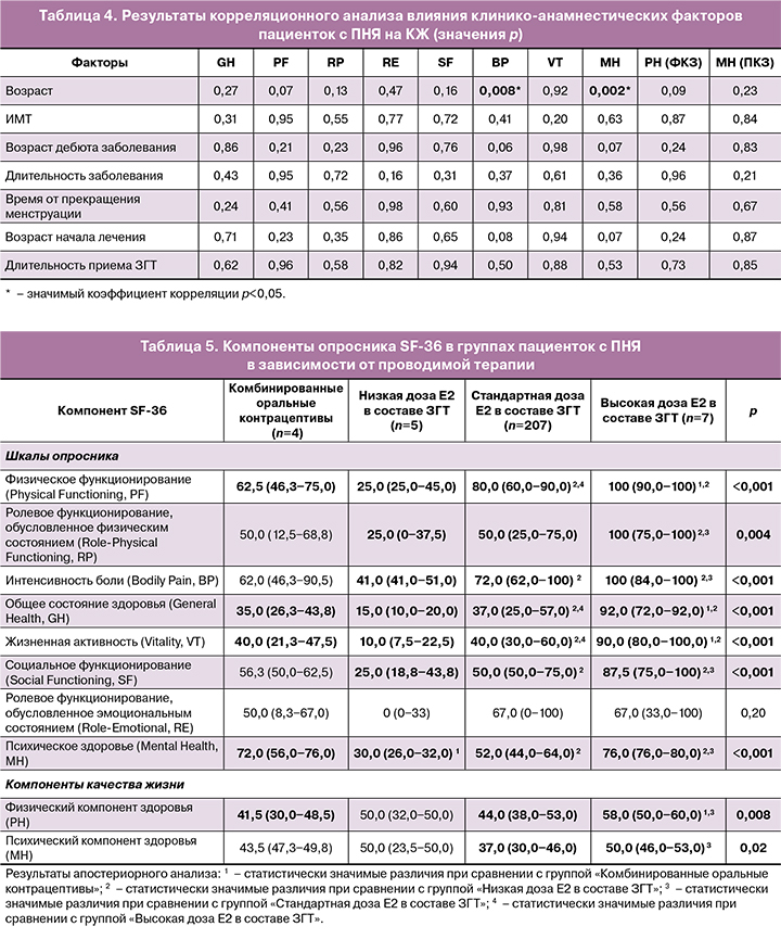 В ходе исследования было оценено влияние возраста, ИМТ, особенностей заболевания и длительности проводимой ЗГТ на КЖ пациенток с ПНЯ при помощи корреляционного анализа. Была выявлена обратная корреляционная связь возраста пациенток с показателями интенсивности боли (r=‑0,205; p=0,008) и психического здоровья (r=‑0,232; p=0,002): при увеличении возраста КЖ пациенток с ПНЯ значимо снижалось по этим двум (но не по остальным шести) компонентам опросника SF‑36. КЖ пациенток с ПНЯ не было связано с ИМТ, возрастом дебюта и продолжительностью заболевания, а также с длительностью приема ЗГТ (p>0,05) (табл. 3, 4).
