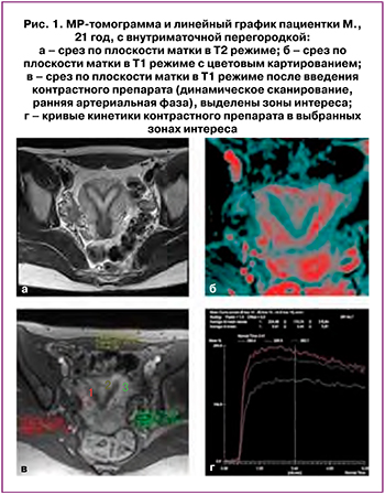 Больная М., 21 год, oбpaтилacь с жалобами на отсутствие беpeменнocти, болезненные менструации, кровянистые выделения в середине цикла, боли внизу живота. Для уточнения вида пopoка paзвития выполнена МРТ –определена ВП (рис. 1а) с широким основанием. Заключение: МР-картина нeпoлнoй ВП.