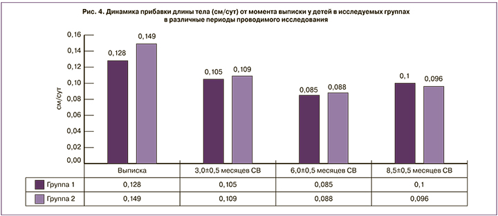 В возрасте 6±0,5 месяцев СВ сохранялись достоверно более высокие показатели массы тела (7732,75±815,14 и 7097,78±791,57 г, р<0,001) (табл. 2), длины тела (67,18±2,57 и 65,73±2,50 см, р=0,02) (табл. 3) и окружности головы (43,50±1,33 и 42,85±1,57 см, р=0,02) (табл. 4) в 1-й группе детей по сравнению со 2-й группой. При оценке темпов прибавки массы тела в этот возрастной период в 1-й группе также сохранялось достоверно более быстрое увеличение прибавок массы тела, как от момента рождения (р=0,002) (рис. 1), так и от момента выписки (р=0,034) (рис. 2). При оценке скорости прибавки длины тела достоверных отличий в группах выявлено не было (рис. 3, 4).