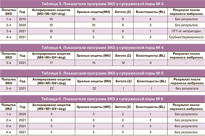 Супружеская пара № 2: К., 34 года (ж), К., 33 года (м), Москва, национальность: русские. В течение 10 лет половой жизни без предохранения в браке беременность не наступала. В 2015 г. был установлен диагноз: «Бесплодие неясного генеза», была проведена овариальная стимуляция с внутриматочной инсеминацией, беременность не наступила. С 2017 по 2021 гг. было три попытки ЭКО с получением достаточного количества ооцитов (12, 14, 21 ооцитов соответственно), но низким выходом бластоцист (1, 2, 2 бластоцисты соответственно), переносом одной бластоцисты в каждой программе, криопереносом оставшихся бластоцист, пригодных для переноса по данным преимплантационного генетического тестирования на анеуплоидии (ПГТ-А), беременность не наступила (табл. 2).