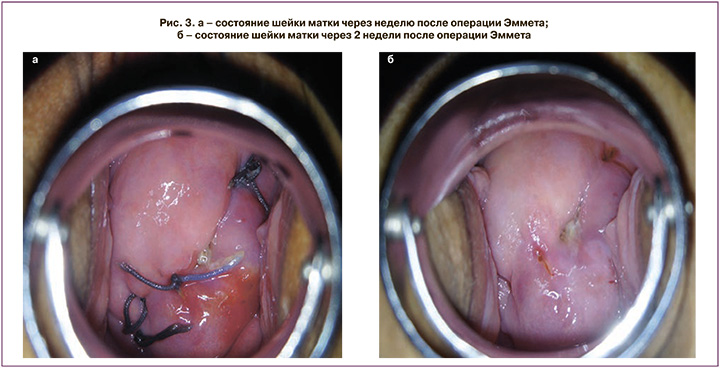 Контрольный осмотр проводился через 1 и 2 недели после оперативного лечения. При этом у всех пациенток основной группы констатирована состоятельность швов (рис. 3). Воспалительные изменения при кольпоскопическом осмотре и картина воспаления при микроскопии отделяемого из цервикального канала и влагалища отсутствовали.