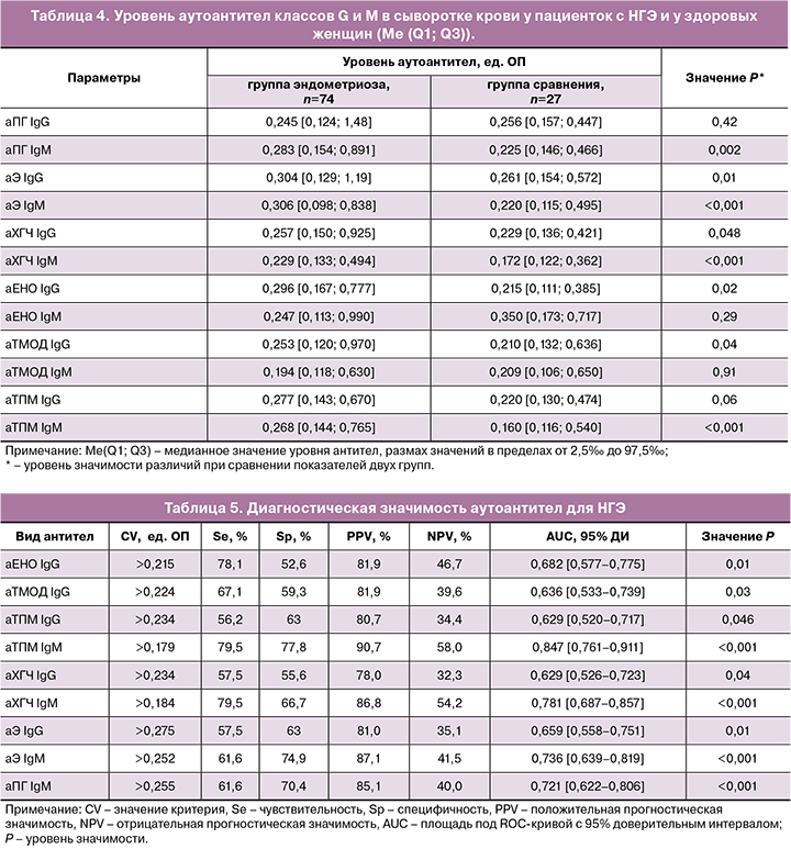 В таблице 4 представлены уровни аутоантител классов G и М в обследованных группах. У пациенток с эндометриозом медианные уровни IgM-антител к Э, ПГ, ХГЧ, ТПМ, а также IgG-антител к Э, ХГЧ, ЕНО и ТМОД были значимо выше, чем у женщин в группе сравнения.