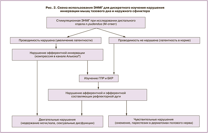 На наш взгляд, комплексная оценка при стимуляционной ЭНМГ последовательно: сначала – М-ответа, потом – смешанного возвратно-рефлекторного ответа и затем – БКР позволяет дискретно изучить как нарушение иннервации на дистальном участке эфферентного звена на проксимальном участке полового нерва, так и весь рефлекторный путь (рис. 2).