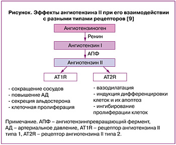 Хорошо известно, что в репродуктивной системе человека присутствует локальная ренин-ангиотензиновая система, которая участвует в контроле и регуляции развития фолликулов и ангиогенезе в яичниках, осуществлении плацентарной и маточной функций. Эффекты, оказываемые ангиотензином II, опосредованы его взаимодействием с двумя типами рецепторов (angiotensin II receptor type 1, AT1R, и angiotensin II receptor type 2, AT2R) (рисунок) [9].