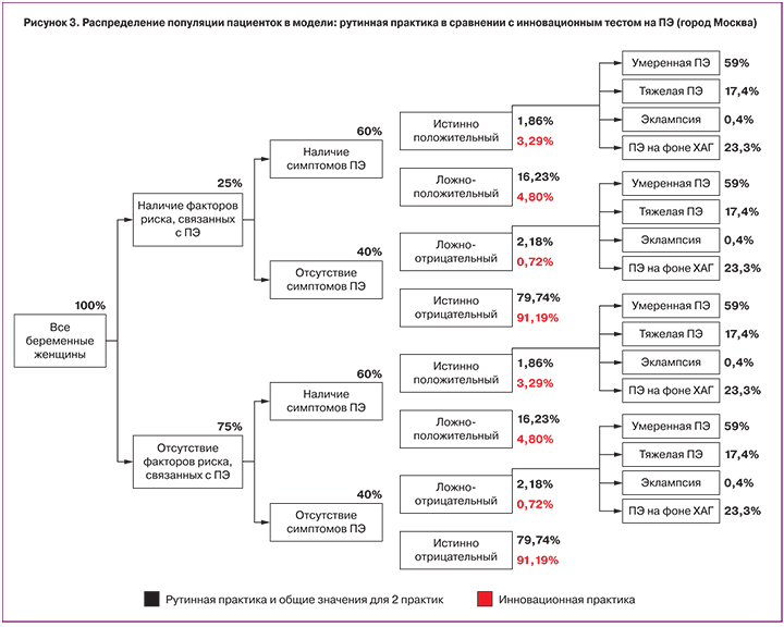 Предполагалось, что вся популяция беременных Российской Федерации будет подвергнута скринингу на ПЭ во второй половине беременности в соответствии с первым или вторым сценарием. При этом 25% популяции беременных попадало в группу пациенток с наличием факторов риска развития ПЭ. Среди факторов риска ПЭ предполагался учет следующих: ПЭ в акушерском анамнезе; отсутствие беременности в анамнезе; ХАГ; многоплодная беременность; гестационный диабет [11]. Каждая группа была представлена подгруппами с наличием (60%) и отсутствием (40%) симптомов ПЭ. Кроме того, пациентки в модели распределялись в зависимости от клинических исходов, таких как умеренная ПЭ, тяжелая ПЭ, эклампсия и ПЭ на фоне ХАГ.