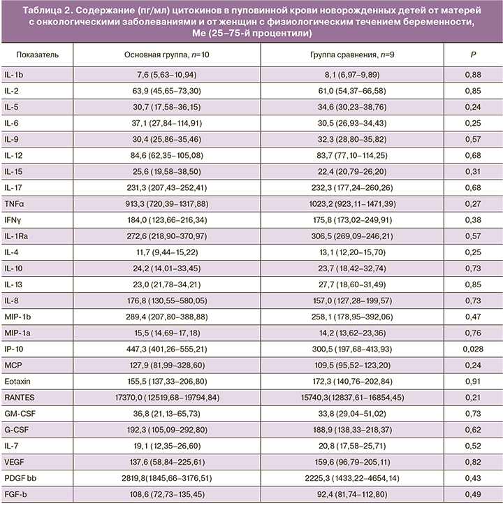В проспективное когортное исследование включены 10 беременных женщин с онкологическими заболеваниями, получавших химиотерапию во время беременности, и их новорожденные дети. Группу сравнения составили 9 женщин с физиологическим течением беременности и их новорожденные. Осуществляли забор периферической венозной крови у женщин перед родоразрешением, крови из вены пуповины и периферической крови новорожденных в возрасте 3 суток и 1 месяца жизни. Содержание цитокинов в плазме определяли мультиплексным методом на анализаторе Bioplex 200 (Bio-Rad, USA) с применением коммерческого набора (Bio-Rad, USA). Оценивали уровень провоспалительных (интерферон (IFN)γ, фактор некроза опухоли (TNF)α, интерлейкины (IL)-1b, IL-2, IL-6, IL-9, IL-12, IL-15, IL-17) и противовоспалительных (IL-4, IL-5, IL-10, IL-13, антагонист рецептора IL-1 (IL-1Ra)) цитокинов, хемокинов (IL-8, моноцитарный (MCP-1) и эозинофильный (Eotaxin) хемотаксические факторы, макрофагальные белки воспаления (MIP-1α, MIP-1β), хемокин, экспрессируемый и секретируемый Т-клетками при активации (RANTES), индуцируемый интерфероном-γ белок (IP-10)) и ростовых факторов (васкуло-эндотелиальный (VEGF) и тромбоцитарный (PDGF bb) факторы роста, основной фактор роста фибробластов (FGF-b), колониестимулирующие факторы (G-CSF, GM-CSF), IL-7).