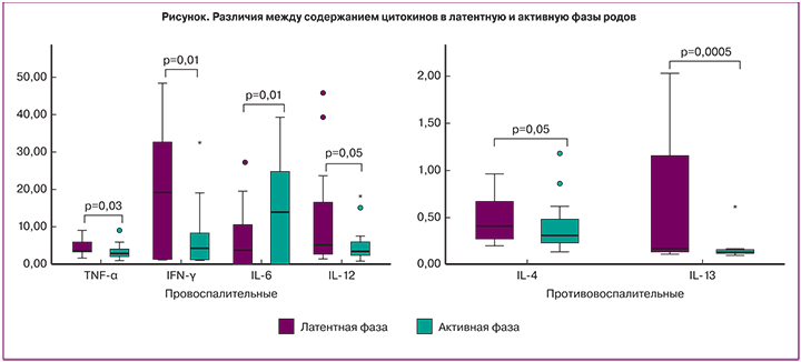 Как показали полученные результаты, по сравнению с латентной фазой родов активная фаза характеризуется повышением содержания провоспалительного цитокина IL-6 и снижением: TNF-α, IFN-γ, IL-12, а также снижением противовоспалительных цитокинов IL-4 и IL-13. Так, отмечено повышение уровня IL-6 в 3,0 раза (р=0,01), снижение уровня TNF-α в 1,2 раза (р=0,03), IFN-γ в 1,7 раза (р=0,01), IL-12 в 2 раза (р=0,05), IL-4 в 1,1 раза (р=0,05) и IL-13 в 1,9 раз (р=0,0005). Различий в содержании других исследованных цитокинов не обнаружено. На рисунке представлены значимые различия между содержанием цитокинов в латентную и активную фазы родов.