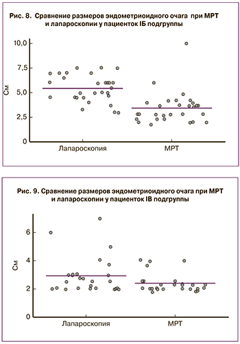 Как представлено на рис. 9, средний размер эндометриоидного очага у пациенток (IВ подгруппа), по данным МРТ, составил 3,4 см, по данным лапароскопии – 5,4 см, что указывает на то, что МРТ является точным методом для выявления патологических образований, однако степень распространенности патологического процесса и его точные размеры можно определить только интраоперационно.