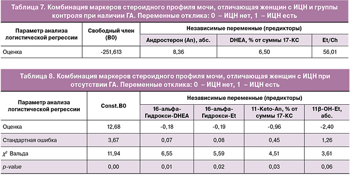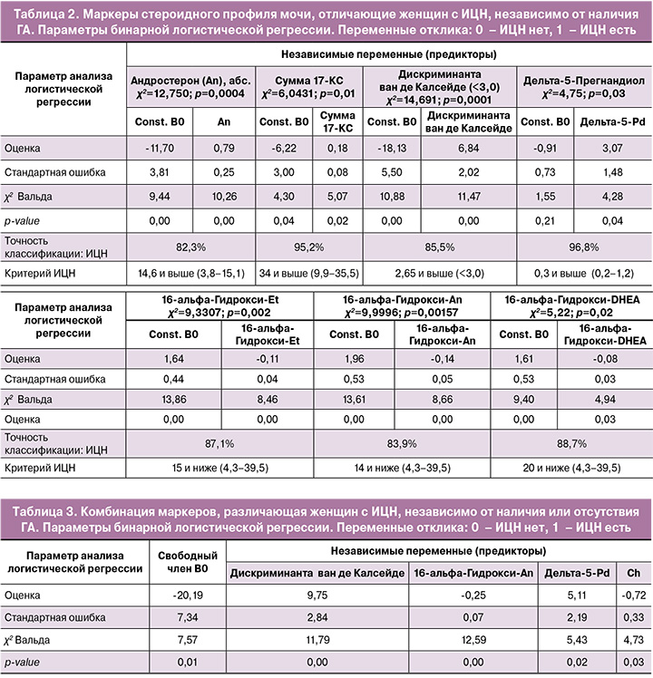 Установлена также комбинация маркеров стероидного профиля мочи, различающая женщин с ИЦН, независимо от наличия или отсутствия ГА (табл. 3).