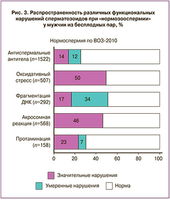 Цель. Установить структуру нарушений качества спермы у мужчин из бесплодных пар и разработать алгоритм их ведения. Материалы и методы. Клинико-лабораторное обследование 4088 бесплодных пар (Б) без установленного женского фактора; контрольная группа – 365 фертильных мужчин (Ф), жены которых зачали в естественном цикле за последние 12 недель. Тип исследования – аналитическое одномоментное многоцентровое. Результаты. Нарушения качества спермы в Б наблюдаются чаще, чем в Ф: азооспермия – 4,2% и 0% случаев (р<0,001), криптозооспермия – 1,6% и 0% (p<0,01), олигозооспермия – 17,4% и 2,2% (р<0,001), астенозооспермия – 45,5% и 22,1% (р<0,001), тератозооспермия – 27,5% и 11,3% (р<0,001), олигоспермия – 5,3% и 1,7% (p<0,05), антиспермальные антитела (MAR-IgG>50%) – 12,3% и 4,8% (р<0,001), пиоспермия – 17,1% и 8,1% (р<0,001), нормозооспермия – 47,0% и 70,0% (р<0,001). Средние и различия рангов всех параметров спермограммы в Б существенно хуже, чем в Ф (р<0,001), кроме объема и процента аномальных форм (p>0,05). При нормозооспермии в Б имели место функциональные нарушения сперматозоидов: повышенная фрагментация ДНК (51%), оксидативный стресс (50%), нарушения акросомной реакции (46%) и протаминации (30%). Заключение. В 2/3 случаев снижение фертильности мужчин – следствие функциональных нарушений сперматозоидов. У фертильных нормозооспермия, по ВОЗ-2010, наблюдается в 70% случаев, что свидетельствует о региональных особенностях диапазона референсных значений. Предложен алгоритм ведения пациентов при различных спермиологических диагнозах в специализированных учреждениях третьего уровня.