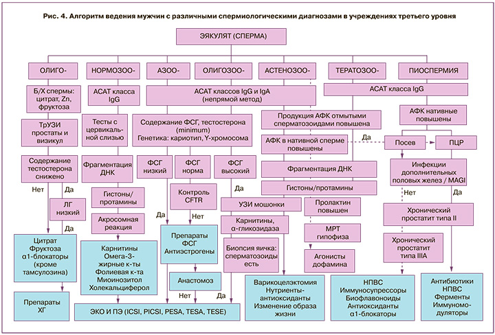 На рис. 4 представлен рекомендуемый нами алгоритм ведения мужчин из вынужденно бездетных пар, учитывающий как традиционные спермиологические диагнозы (олиго-, астено- и тератозооспермия, пиоспермия), так и различные функциональные нарушения. Следование такому алгоритму, по нашему мнению, позволит применять различное возможное лечение – гонадотропины, антиэстрогены, нутриенты-антиоксиданты, антибиотики и др. [1, 8, 25, 27] – не эмпирически, а патогенетически обоснованно.