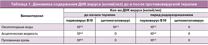 Дозу иммуноглобулина рассчитывали, исходя из массы тела – 1,0 мл на кг массы тела плода. В пуповинной крови обнаружена ДНК парвовируса В19 108 копий/мл, ДНК цитомегаловируса не обнаружена (табл. 1).