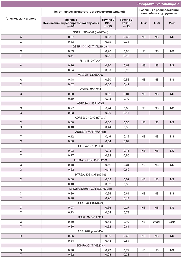 Материал и методы. В исследование включен 101 новорожденный ребенок с диагнозом врожденная пневмония, нуждавшийся в респираторной терапии с рождения. У всех пациентов была взята периферическая кровь для генотипирования ДНК. Дети были разделены на три группы. I группа включала 63 новорожденных, у которых респираторная терапия ограничилась назальной неинвазивной поддержкой: СРАР или неинвазивной искусственной вентиляцией легких (ИВЛ) в режиме двухуровневого СРАР (Biphasic). II группу составили 25 пациентов, потребовавших интубации и проведения инвазивной традиционной ИВЛ. В III группу вошло 13 детей, нуждавшихся в «жестких» параметрах традиционной ИВЛ (МАР> 12 Н2O и FiO2> 0,5) и в переводе на высокочастотную осцилляторную ИВЛ (ВЧОВ).
