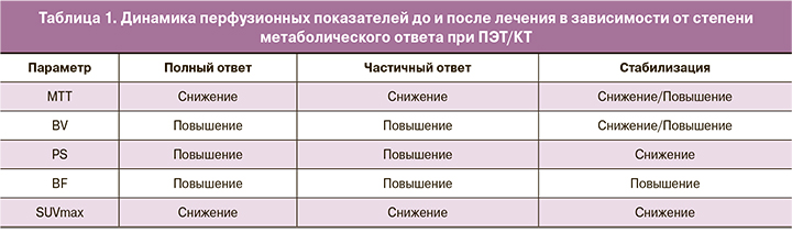 При количественной оценке динамики перфузионных показателей до и после проведения селективной ХТ в группе с полным метаболическим ответом определялось повышение BV, BF и PS на 73,6, 15,2 и 63,5% соответственно и снижение МТТ на 98,2% (табл. 2).