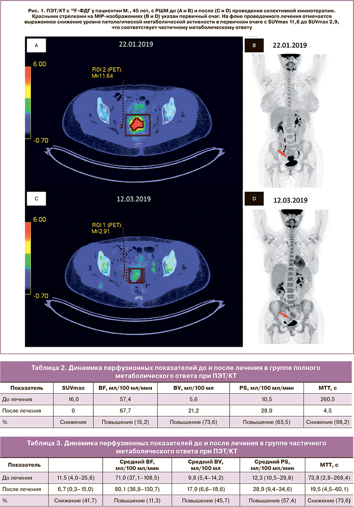 Учитывая собственный опыт и обнадеживающие результаты, в МНИОИ им. П.А. Герцена – филиал ФГБУ «НМИЦ радиологии» Минздрава России было предпринято пилотное исследование, целью которого являлось определение возможностей КТ-перфузии в оценке местной эффективности селективной ХТ при местнораспространенном РШМ в сопоставлении с данными ПЭТ/КТ с 18F-ФДГ.