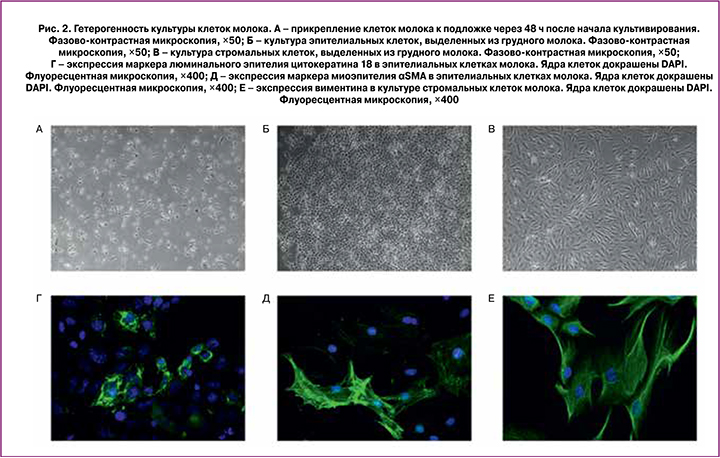 При исследовании с помощью световой микроскопии было подтверждено, что в грудном молоке содержится значительное количество гетерогенных по своим морфологическим и функциональным свойствам клеток. При переносе клеток в ростовую среду (DMEM/F12, содержащую 10% эмбриональной телячьей сыворотки) мы наблюдали прикрепление клеток к культуральной подложке (рис. 2, А). Большая часть клеток в дальнейшем откреплялась от подложки, оказавшись неспособной к пролиферации в условиях in vitro, однако через 5–7 суток мы наблюдали колонии клеток с характерным для эпителиальных культур рисунком поверхности типа «черепица», а через 2–3 недели появлялись колонии стромальных клеток, образующих характерный для фибробластоподобных клеток волновой рисунок (рис. 2, Б, В). Среди эпителиальных клеток присутствовали клетки, экспрессирующие маркер люминального эпителия цитокератин 18, а также миоэпителиальные клетки, экспрессирующие гладкомышечный актин (αSMA) (рис. 2, Г, Д). Стромальные клетки экспрессировали виментин (рис. 2, Е).
